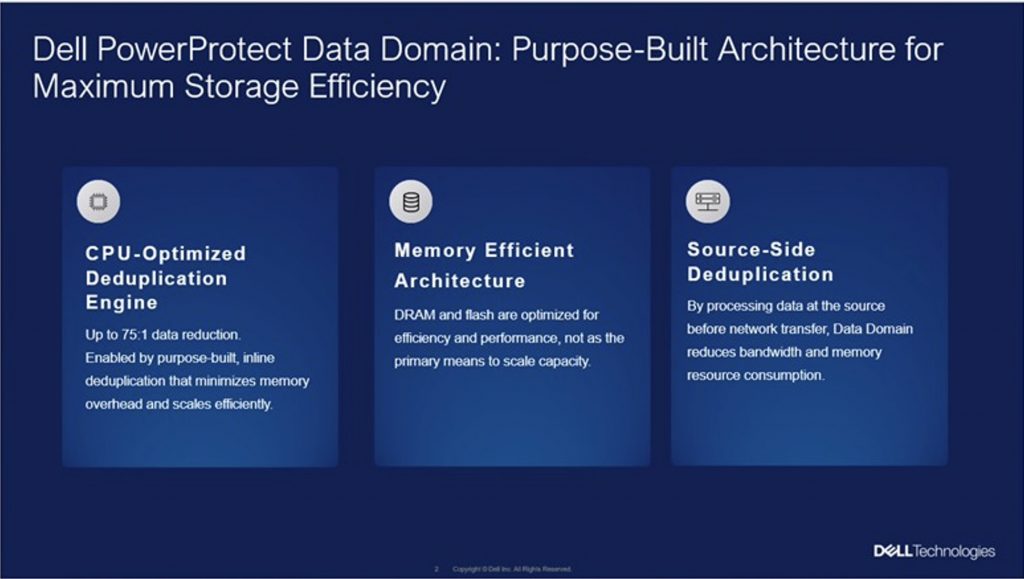 Dell PowerProtect Data Domain则基于截然不同的设计理念:最大化每个基础架构单位的可用容量。通过高效的数据缩减技术、基于RAM的智能元数据与缓存管理,以及专用架构设计,Data Domain能够以更少的服务器、SSD、端口及电力资源保护更多的数据,同时在扩展过程中显著降低运维复杂性。